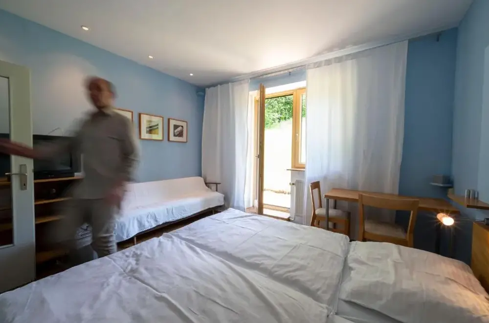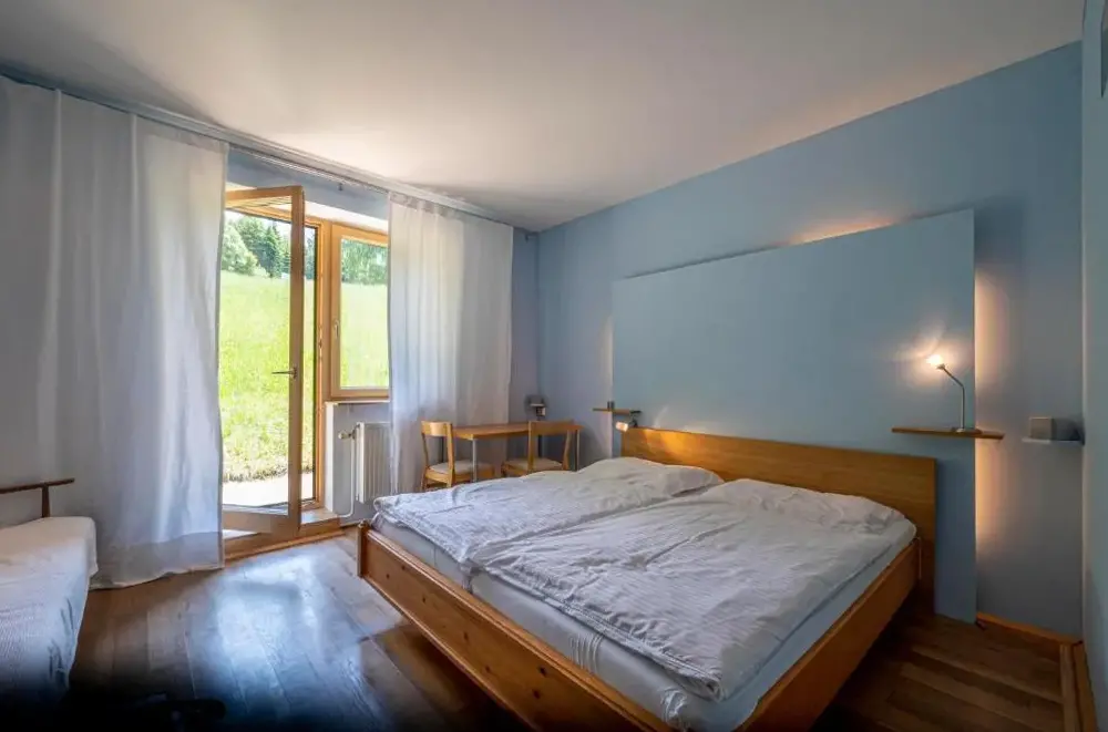 Die Terrasse vor unserem Zimmer in einem wunderschönen Wiesenhang.Exquisite Cousine.Bücher und Flugblätter.Fotografien der Natur auf Leinwand.Wanderpfade.